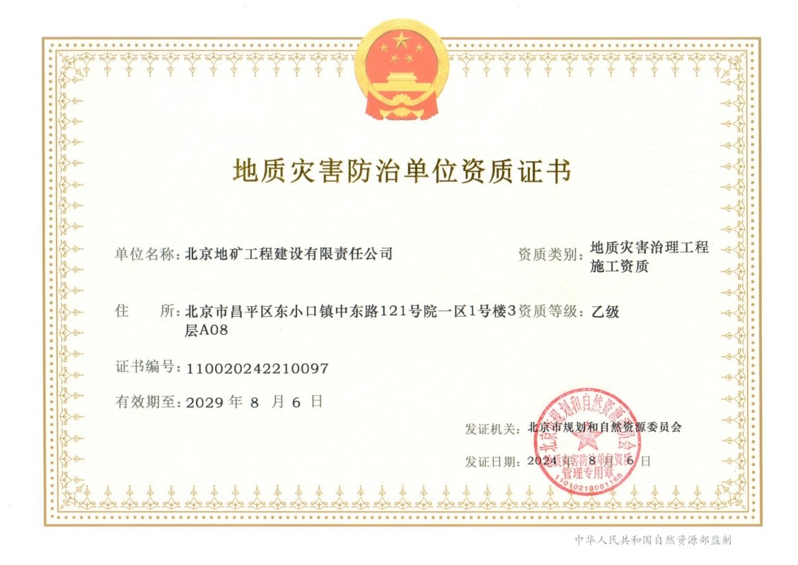 熱烈慶祝北京地礦工程建設(shè)有限責(zé)任公司獲得地質(zhì)災(zāi)害評估和治理工程勘察設(shè)計資質(zhì)和施工資質(zhì)(乙級)